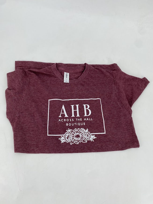 This AHB Tee is part of the Support Tee Collection. Its unisex design makes it perfect for everyone. Crafted in burgundy, this short sleeved tee is comfortable and stylish. Wear it to show your support for your favorite boutique. Adult Sizes