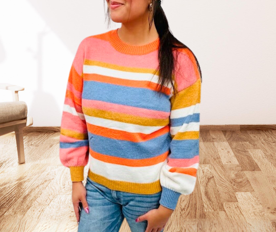 Brighten up your wardrobe with this beautiful Bright Brandie knit sweater. This striped piece features a soft and cozy fabric and a relaxed fit with charming puff sleeves for a touch of style. Enjoy this relaxed fit sweater from fall through spring!